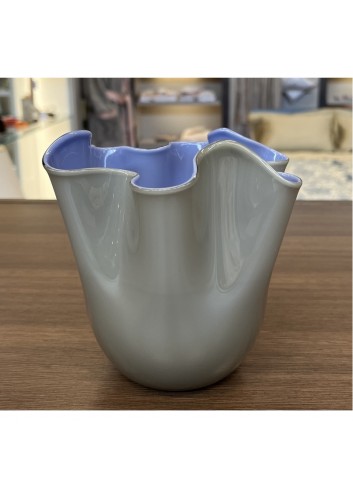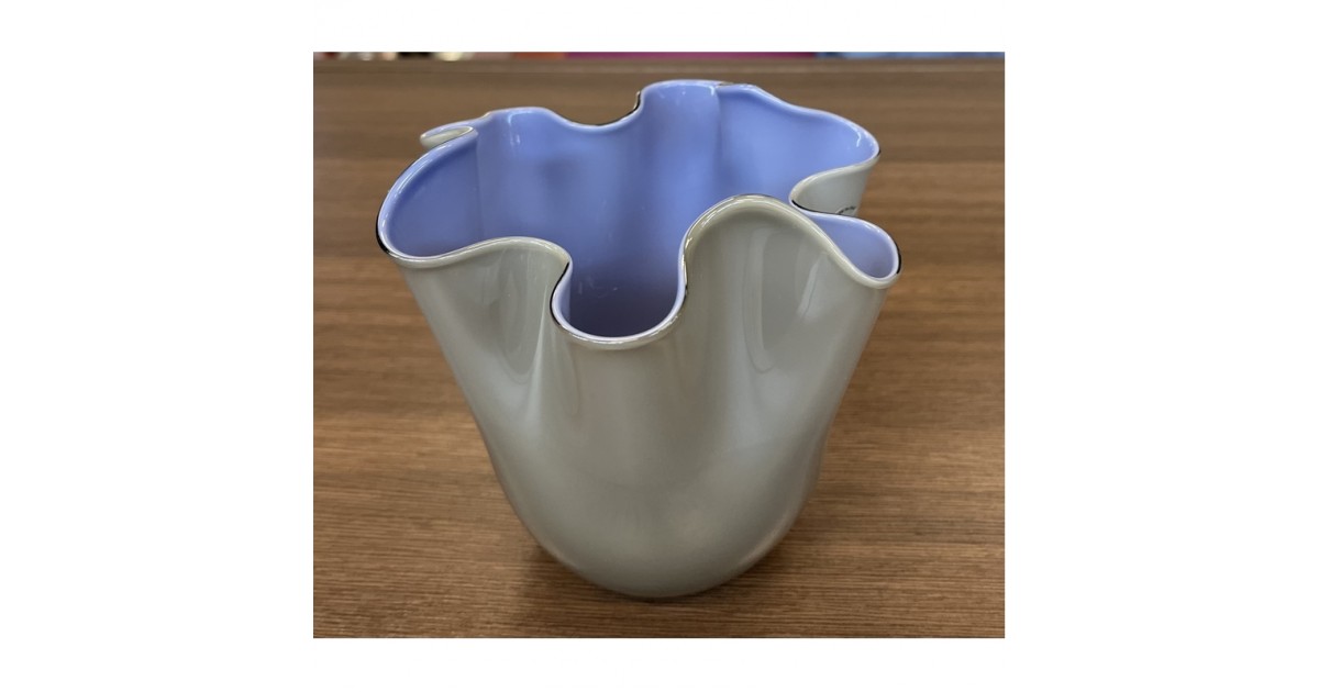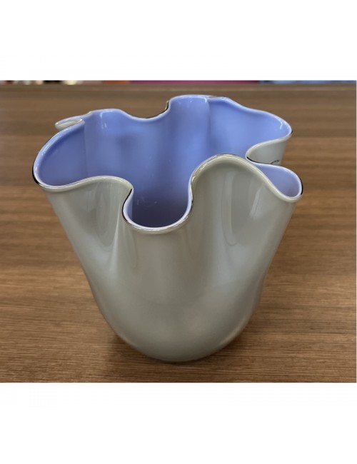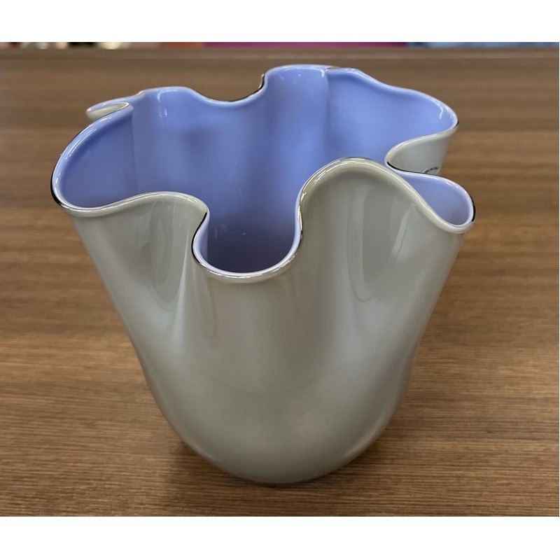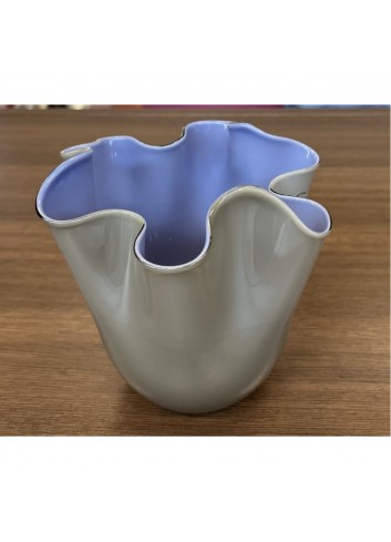 VASO FAZZOLETTO OPALINO TALPA INTERNO INDACO FULVIO BIANCONI E PAOLO VENINI | 1948 cod: 700.04 DIMENSIONI: ALTEZZA 13,5 cm; DIAMETRO 13,5 cm PESO UNITARIO: 0,25 kg MATERIALE: VETRO SOFFIATO OPALINO, MANO VOLANTE