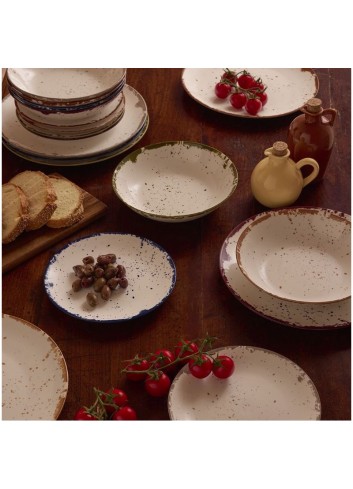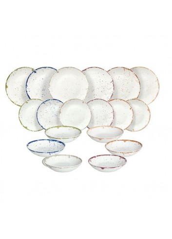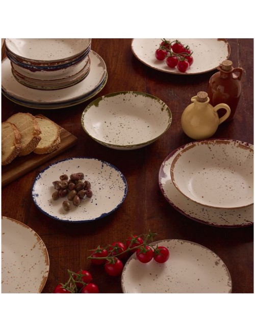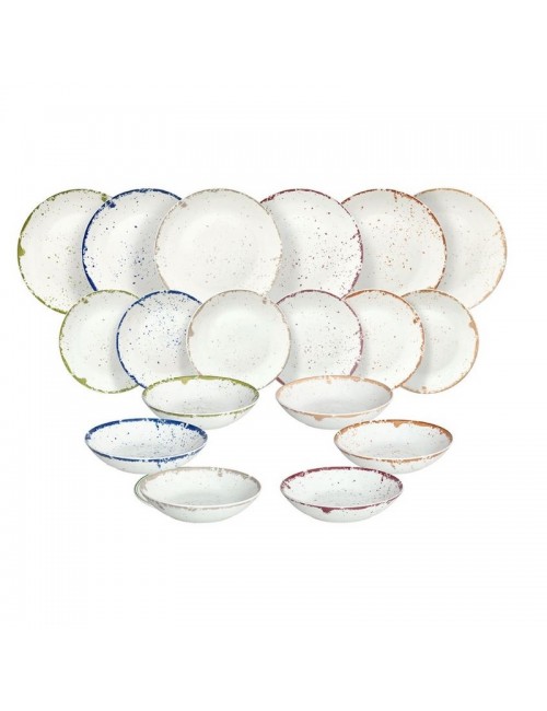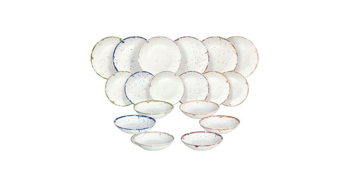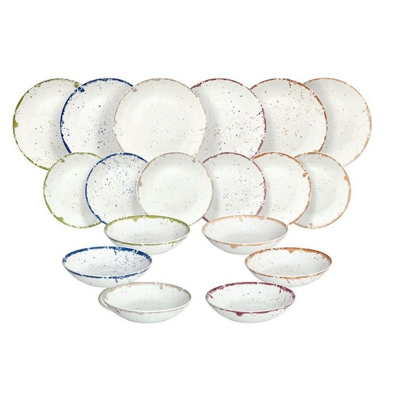 Servizio di piatti da tavola da 18 pezzi linea Moon Osteria Marchio Andrea Fontebasso Colore Multicolor MaterialePorcellana Adatto alla lavastoviglie e microonde Il servizio comprende: 6 piatti piani 27 cm, 6 piatti fondi 20 cm, 6 piatti dessert 19 cm Colori: piatto piani, fondo e dessert verde; piatto piani, fondo e dessert blu; piatto piani, fondo e dessert marrone; piatto piani, fondo e dessert rosso; piatto piani, fondo e dessert grigio; piatto piani, fondo e dessert giallo